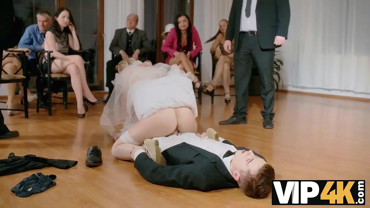 A hot blonde slut gets caught cheating during her wedding ceremony. She gives a deepthroat blowjob to a rod she shouldn't be with, then rides it in cowgirl. The ceremony's attendees watch in shock as she gets pounded and cums loudly, betraying her new husband.